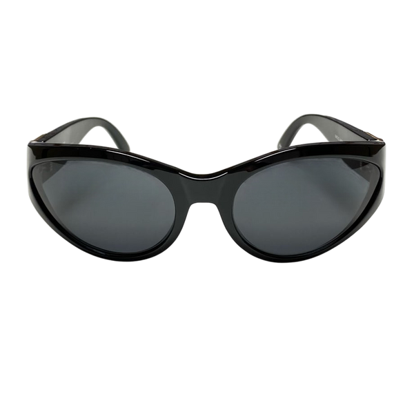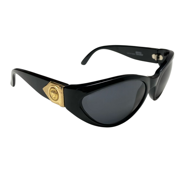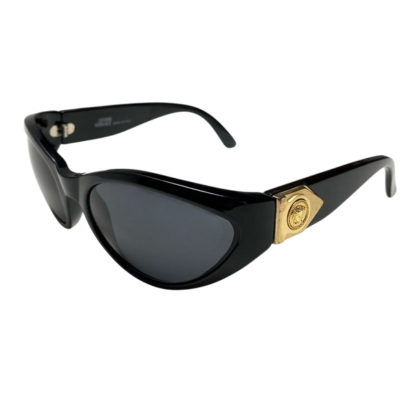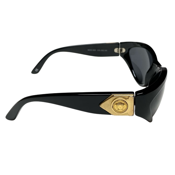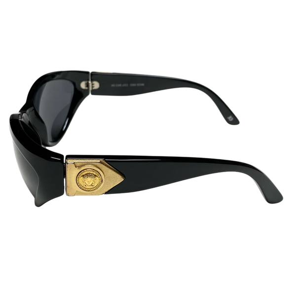 The iconic gold medusa logo on a rarer less commonly seen model of versace sunglasses